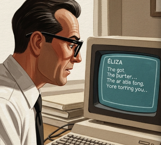 튜링의 꿈을 이어받아, '조셉 와이젠바움'이라는 컴퓨터 과학자가 '엘리자'라는 프로그램을 만들었어요. 엘리자는 마치 심리 상담사처럼 사람들의 말을 따라 하며 대화를 나누는 최초의 '채팅 로봇'이었죠. 사람들은 정말 기계와 대화하는 것 같다며 깜짝 놀랐답니다.
