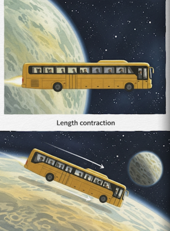 두 번째 비밀! "움직이는 물건은 길이가 짧아져!" 이번엔 엄청나게 긴 우주 버스를 상상해볼까? 이 버스가 우리 앞을 쌩~ 하고 빛의 속도로 지나가면, 우리 눈에는 원래 길이보다 훨씬 짧고 뭉툭하게 보일 거야. 쌩쌩 달리는 자동차가 휙 지나갈 때 옆으로 길게 늘어져 보이는 것과는 반대지. 아주 빠른 세상에서는 공간도 오그라드는 신기한 마법이 일어난단다.