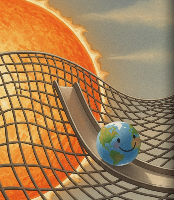 지구가 왜 태양 주위를 뱅글뱅글 도는지 궁금했지? 그건 태양이 지구를 밧줄로 묶어서 끌어당기는 게 아니야. 태양 때문에 움푹 파인 우주 공간을 지구가 미끄럼틀 타듯이 신나게 돌고 있는 거란다. 마치 트램펄린 위에서 볼링공 주변을 굴러가는 구슬처럼 말이야!
